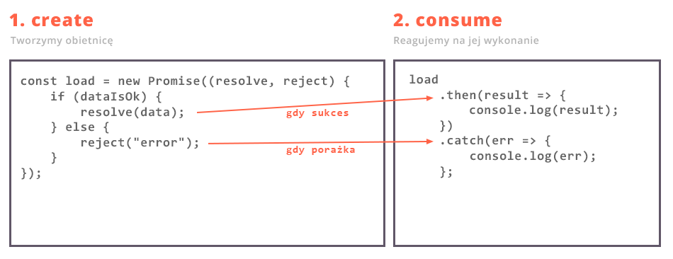 Do stworzenia Promise korzystamy z konstruktora Promise(), który w parametrze przyjmuje funkcję, do której przekazujemy referencję do dwóch funkcji (tak zwanych egzekutorów), które będą wywoływane w przypadku zwrócenia poprawnego lub błędnego kodu.