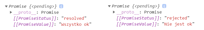 W momencie zakończenia wykonywania takich operacji Promise przechodzi w stan "settled" (ustalony/załatwiony) i zostaje zwrócony jakiś wynik. Status takiego promise przełączany jest odpowiednio w "fulfilled" lub "rejected", a my jako programiści wywołujemy przekazane w parametrach funkcje (resolve lub reject) z przekazanymi do nich wynikami operacji.