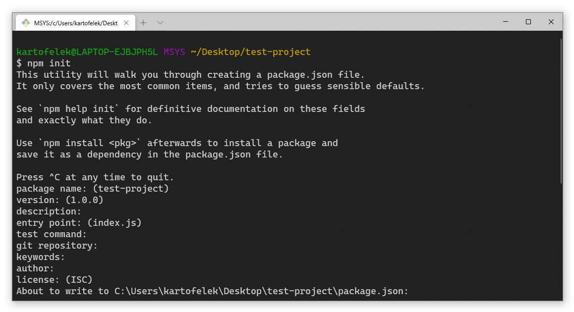 Wystarczy kilka razy nacisnąć Enter. Możemy też użyć polecenia npm init -y które stworzy taki plik bez zadawania nam pytań.