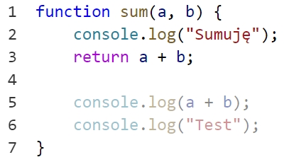 }W wielu edytorach kod leżący za return będzie miał przytłumione kolory, co symbolizuje, że taki kod nigdy sie nie wykona: