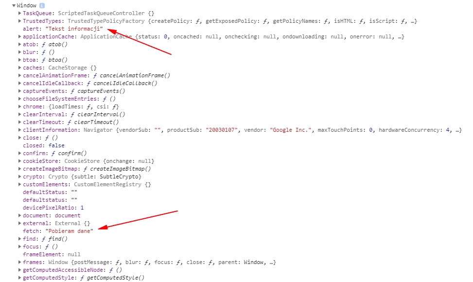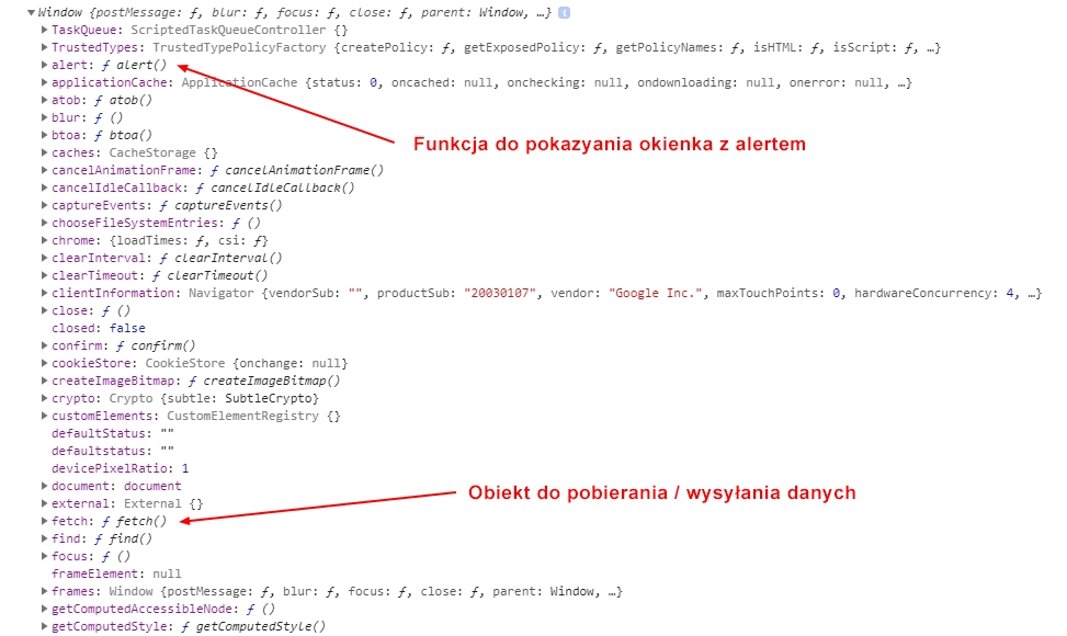 console.log(window.b); //undefinedGdy wypiszemy sobie w konsoli obiekt window, pokaże nam się masa różnych rzeczy, które możemy (i zapewne będziemy) używać: