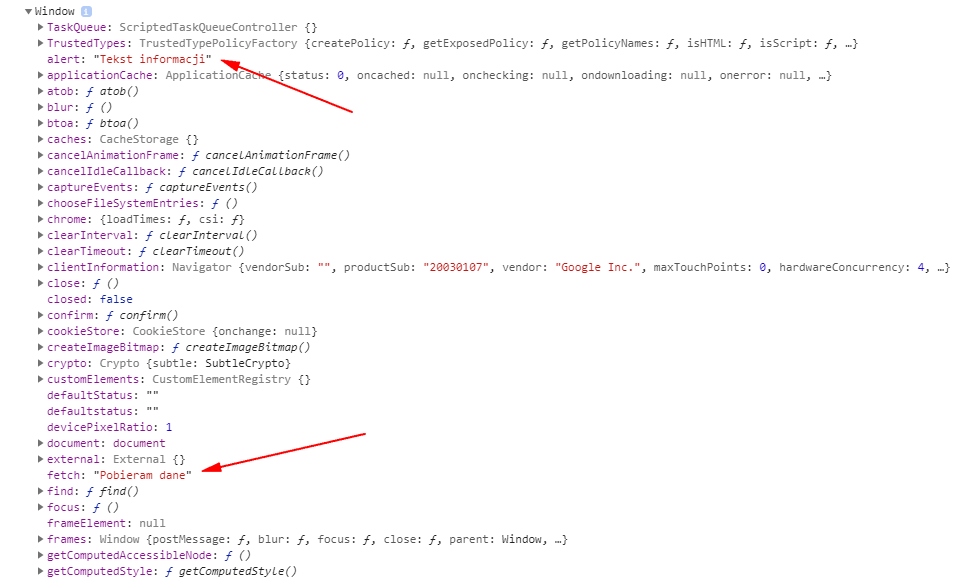 Gdy wypiszemy sobie w konsoli obiekt window, pokaże nam się masa różnych rzeczy, które możemy (i zapewne będziemy) używać: